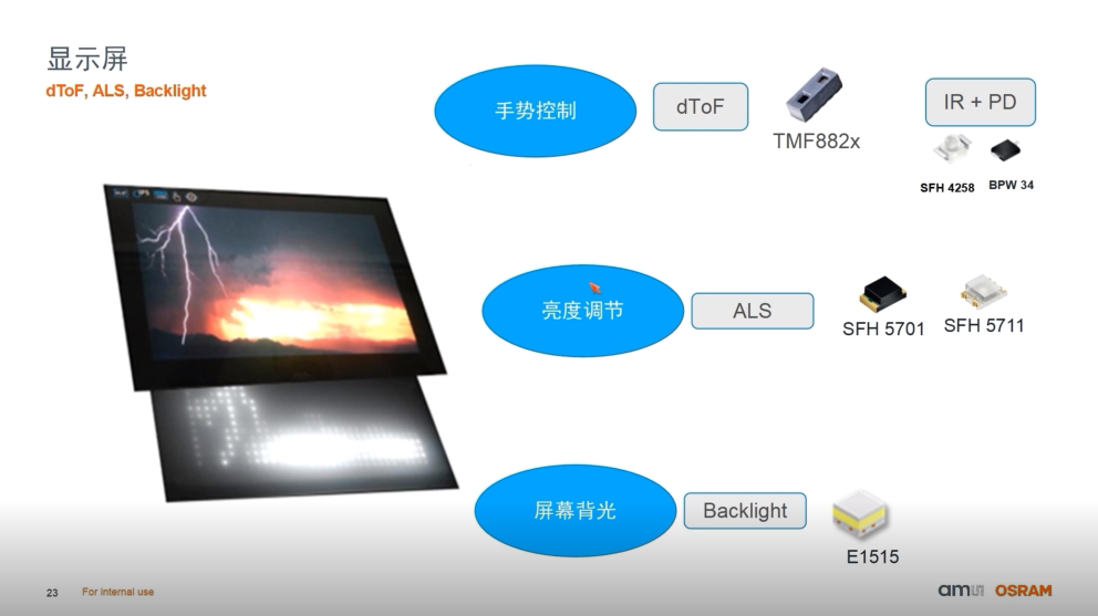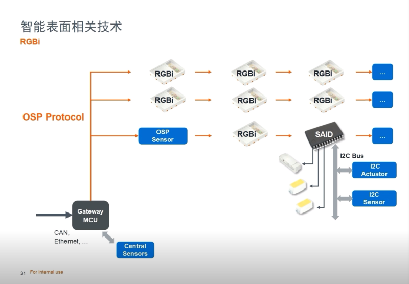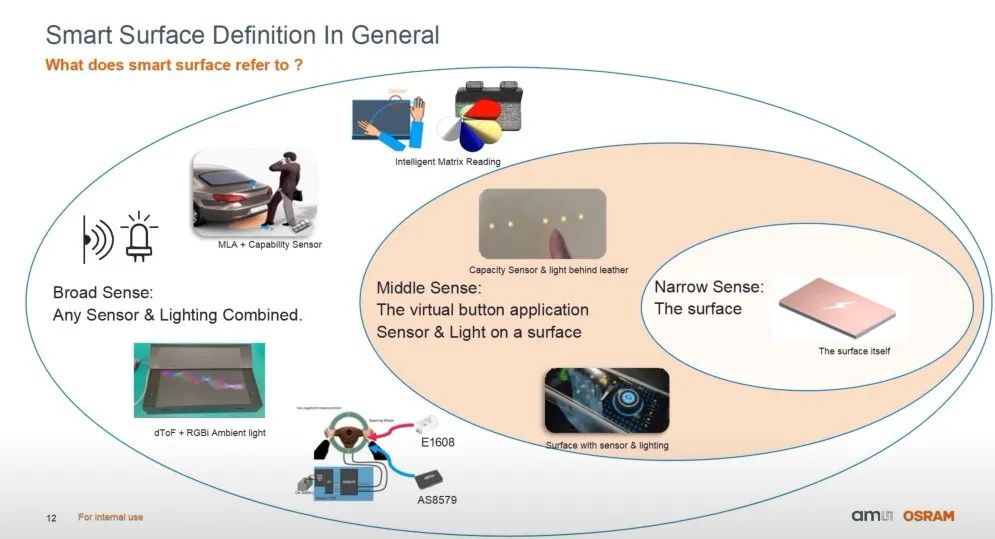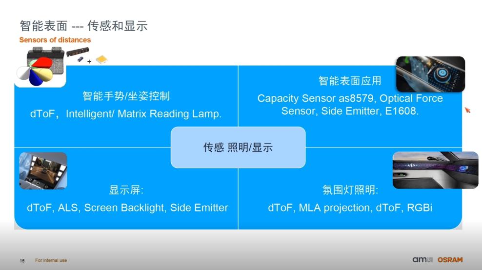 “因此,上面這張圖就囊括了我們跟智能表面相關(guān)的系列產(chǎn)品,除了上面所提及的,還有可以感受環(huán)境光亮度對應(yīng)進行屏幕調(diào)節(jié)的環(huán)境光傳感器ALS,相應(yīng)的LED產(chǎn)品,比如360°發(fā)光的E1515,以及智能RGB產(chǎn)品RGBi,還有同樣可實現(xiàn)艙內(nèi)照明/顯示功能艾邁斯歐司朗獨有的微透鏡陣列(MLA)方案。”