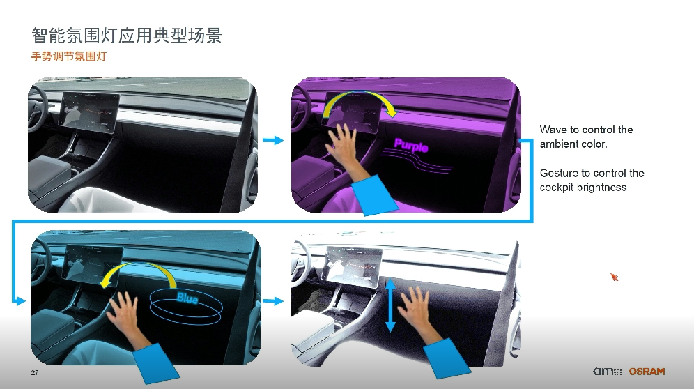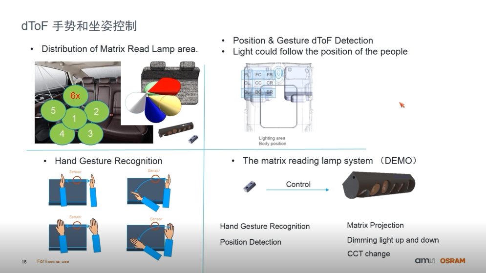 dToF當然也可承載調(diào)節(jié)座艙氛圍的“重任”。事實上,這個思路已經(jīng)被落地?;赿ToF傳感器檢測手勢動作,以此來控制氛圍燈的亮暗、色溫。