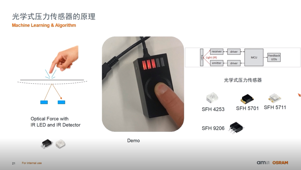當接觸表面時,就需要壓力傳感器。不同于傳統(tǒng)的壓電陶瓷方案,艾邁斯歐司朗的光學壓力傳感器是一個純光學的解決方案。