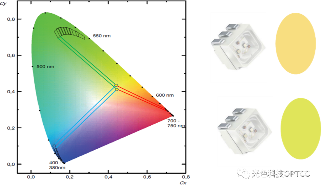 但是,對(duì)于研發(fā)實(shí)驗(yàn)端到生產(chǎn)線而言,對(duì)每一個(gè)設(shè)計(jì)參數(shù)進(jìn)行追蹤和管控的難度是很大的,特別是實(shí)際生產(chǎn)中每增加一項(xiàng)管控的數(shù)據(jù)維度對(duì)于產(chǎn)品成本而言都是一項(xiàng)不小的負(fù)擔(dān)。在行業(yè)的探索和研究中發(fā)現(xiàn),汽車氛圍燈結(jié)構(gòu)中,光導(dǎo)件、擴(kuò)散板等結(jié)構(gòu)造成的偏差來(lái)源來(lái)自于本身物理性質(zhì),如透光率、折射率等。這些特性在生產(chǎn)中會(huì)認(rèn)為這是一個(gè)可預(yù)測(cè)的數(shù)值,能通過一些手段和方法進(jìn)行終效果的修正。而對(duì)于中心發(fā)光模組PCBA端,也就是發(fā)光光源的顏色來(lái)說(shuō),來(lái)料存在BIN區(qū)的問題,引起顏色不一致,校準(zhǔn)修正情況會(huì)復(fù)雜得多。
