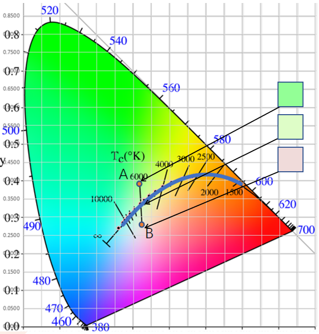如上圖中,A和B點(diǎn)均為6000k色溫,但其色坐標(biāo)則相去甚遠(yuǎn),可以看出A處燈光偏綠,B處燈光偏粉。